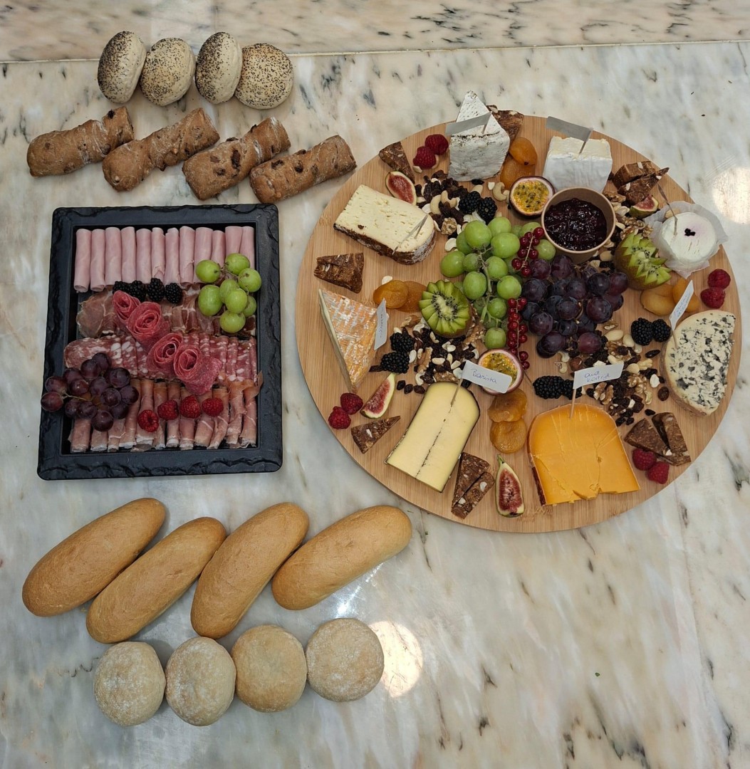 (Assortiment fijne kazen (250 a 300 gram per persoon, min 7 soorten) aangevuld met vers fruit, gedroogd fruit, nootjes, ... incl assortiment broodjes (zachte broodjes, krokante broodjes, notenbroodjes) )